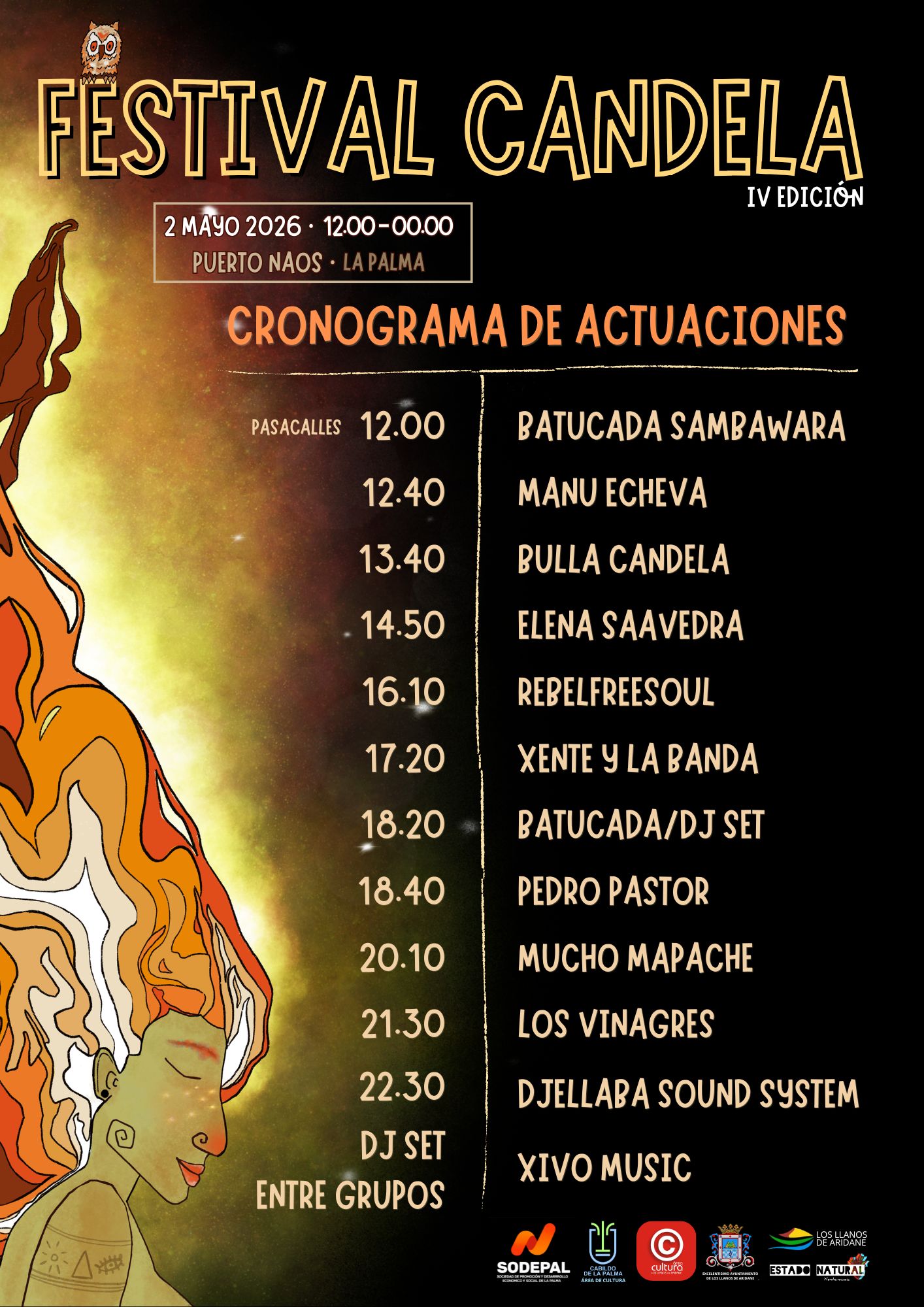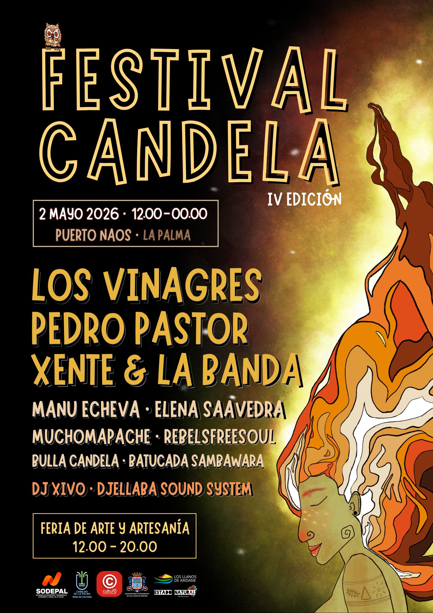 El Festival Candela cuenta con la colaboración del Ayuntamiento de Los Llanos de Aridane y el Cabildo de La Palma, y está patrocinado por Sodepal, en el marco de su apuesta por la cultura como herramienta de dinamización territorial, cohesión social y proyección del sector creativo insular.