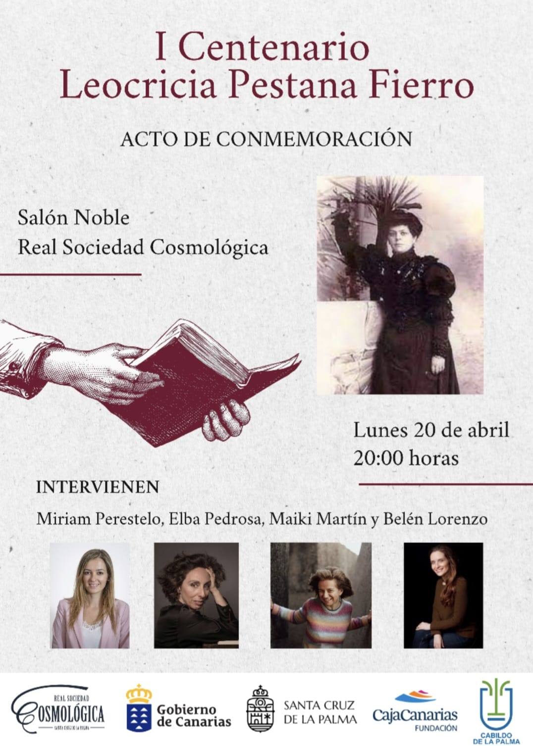 El Salón Noble de la Real Sociedad Cosmológica de Santa Cruz de La Palma acoge el acto de conmemoración del centenario de Leocricia Pestana Fierro, una figura destacada vinculada al ámbito cultural e intelectual de la isla.