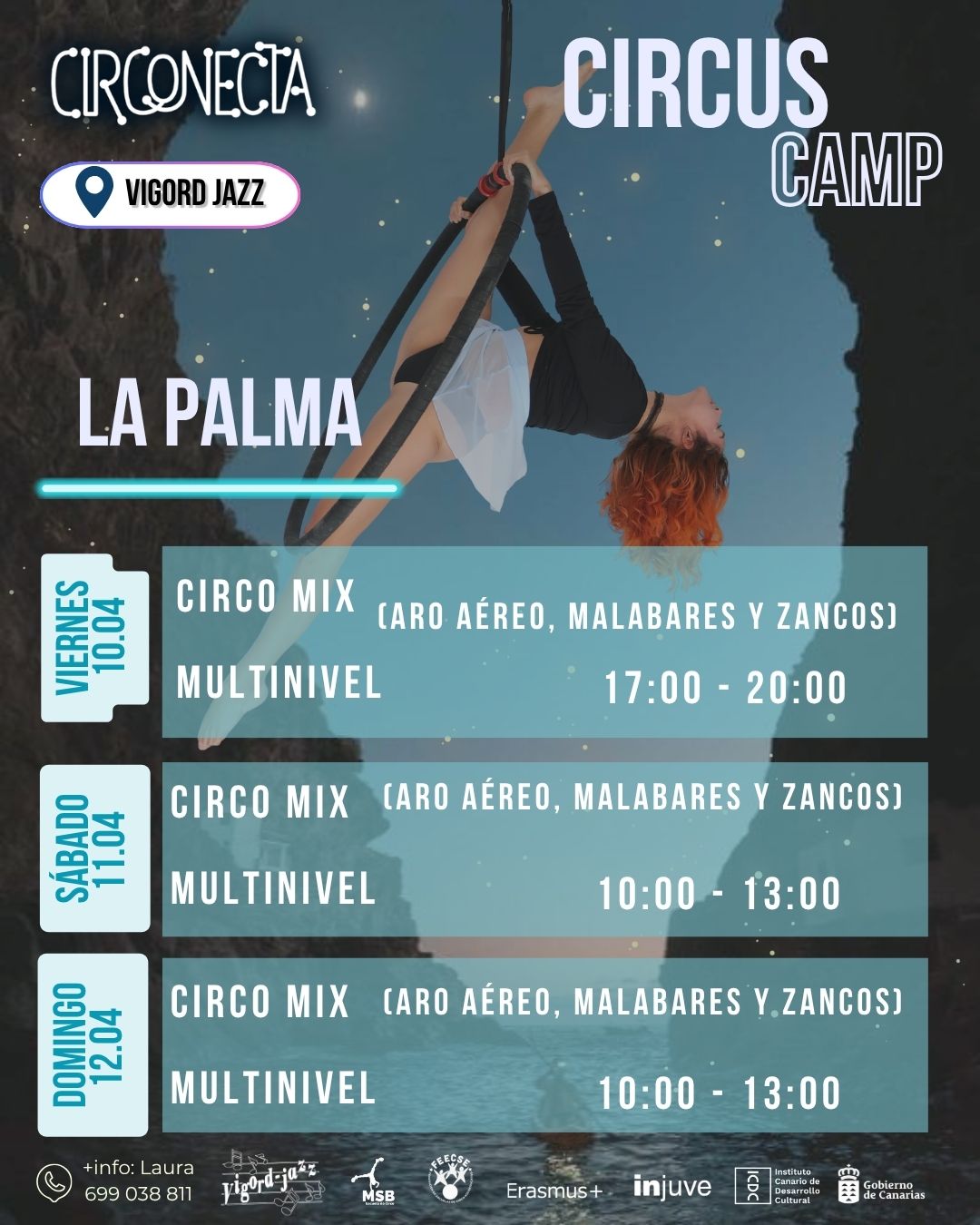 Circonecta Circus Camp La Palma propone un fin de semana de formación escénica en torno al circo, con sesiones de carácter multinivel centradas en aro aéreo, malabares y zancos. La actividad se celebrará en Vigord Jazz, en La Palma, como parte de la programación de Circonecta, iniciativa ligada a la comunidad de la Escuela de Circo MSB Canarias, que este año impulsa distintos workshops y eventos de circo.