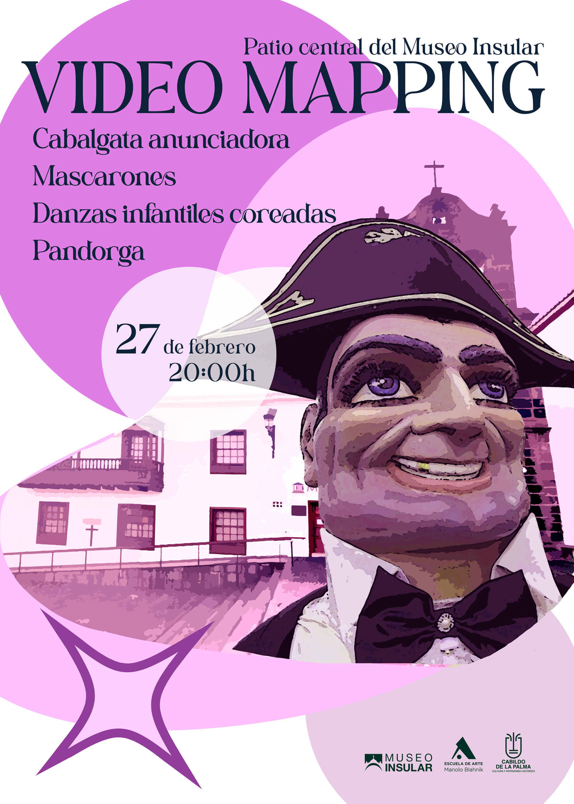 VIDEO MAPPING BAJADA DE LA VIRGEN Cabalgata anunciadora Mascarones Danzas infantiles coreadas Pandorga Tres pases a partir de las 20:00 horas Entrada libre hasta completar aforo. Tags Bajada de La VirgenCabildo de La PalmaLa PalmaSanta Cruz de La Palma